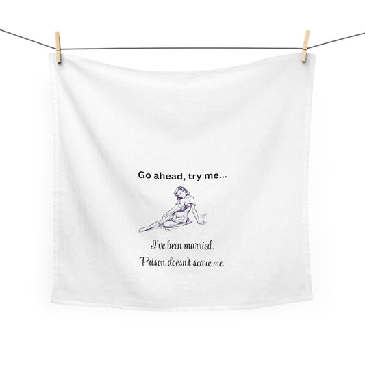 Humorous Tea Towel - 'Go ahead, try me... I've been married. Prison doesn't scare me.' For the brave woman who takes no $*&! from anyone!